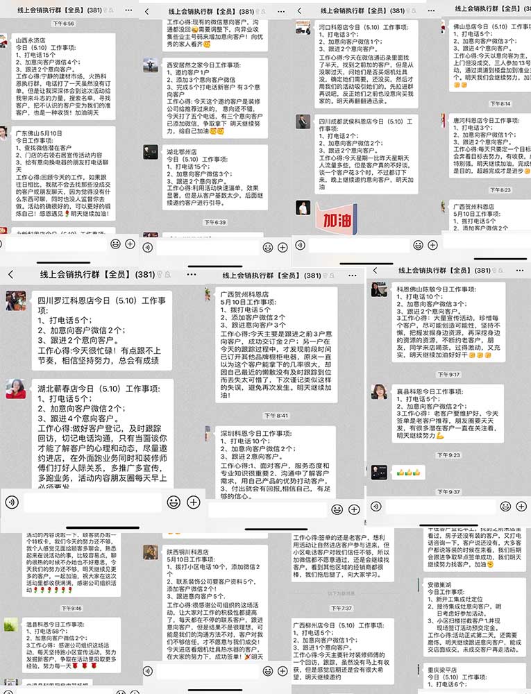 微信超級廠購會,定計劃,定目標(biāo),提升學(xué)習(xí)力,增強(qiáng)執(zhí)行力,凝聚戰(zhàn)斗力,總部操盤賦能終端,助力于門店市場運(yùn)營,帶領(lǐng)科恩家人一路摸高,高效打造有溫度有實體感的戰(zhàn)斗集體。