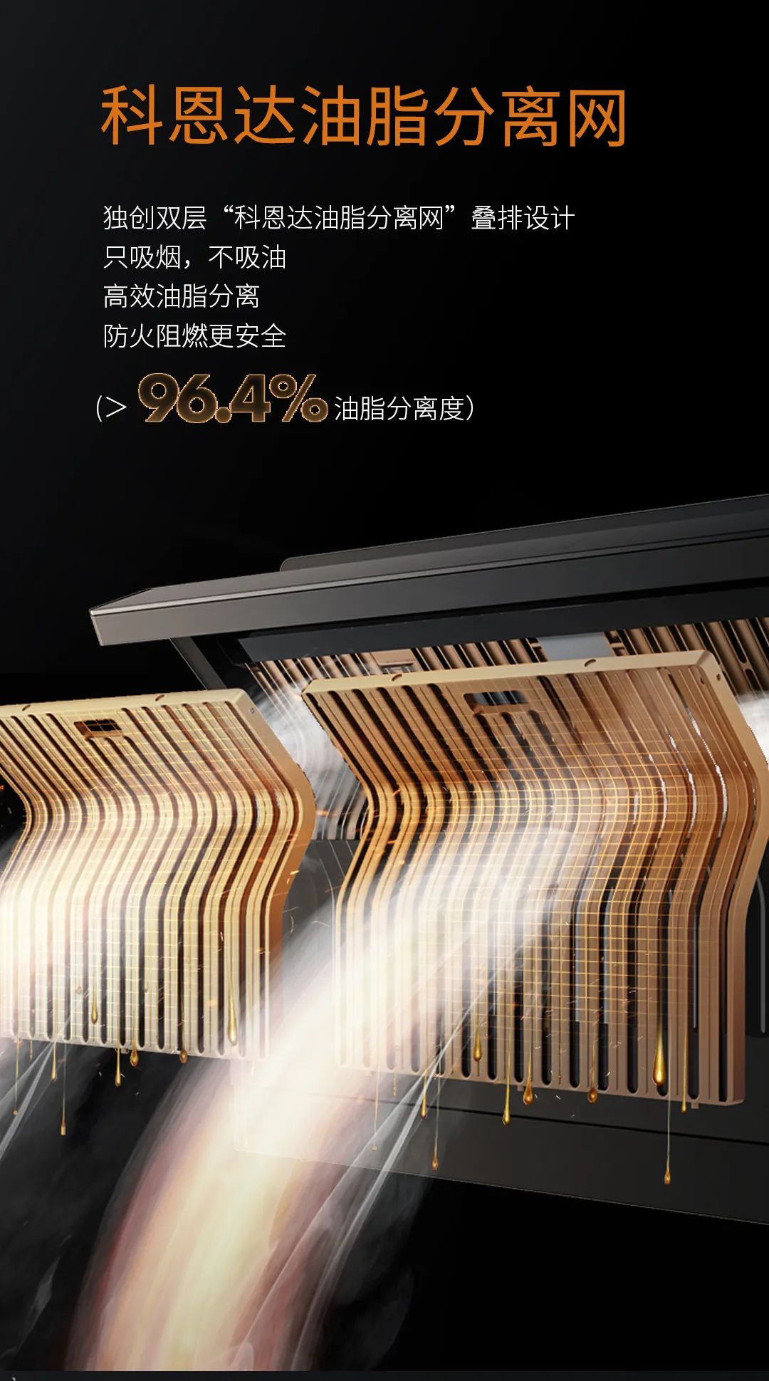 6K省心超體驗二:科學設計免清洗,耐用省心!科恩達油脂分離網完美實現煙機免清洗。科恩達油脂分離網可實現高效油脂分離,油脂分離率>96%,實現油脂不進門,煙機免清洗的理想狀態。