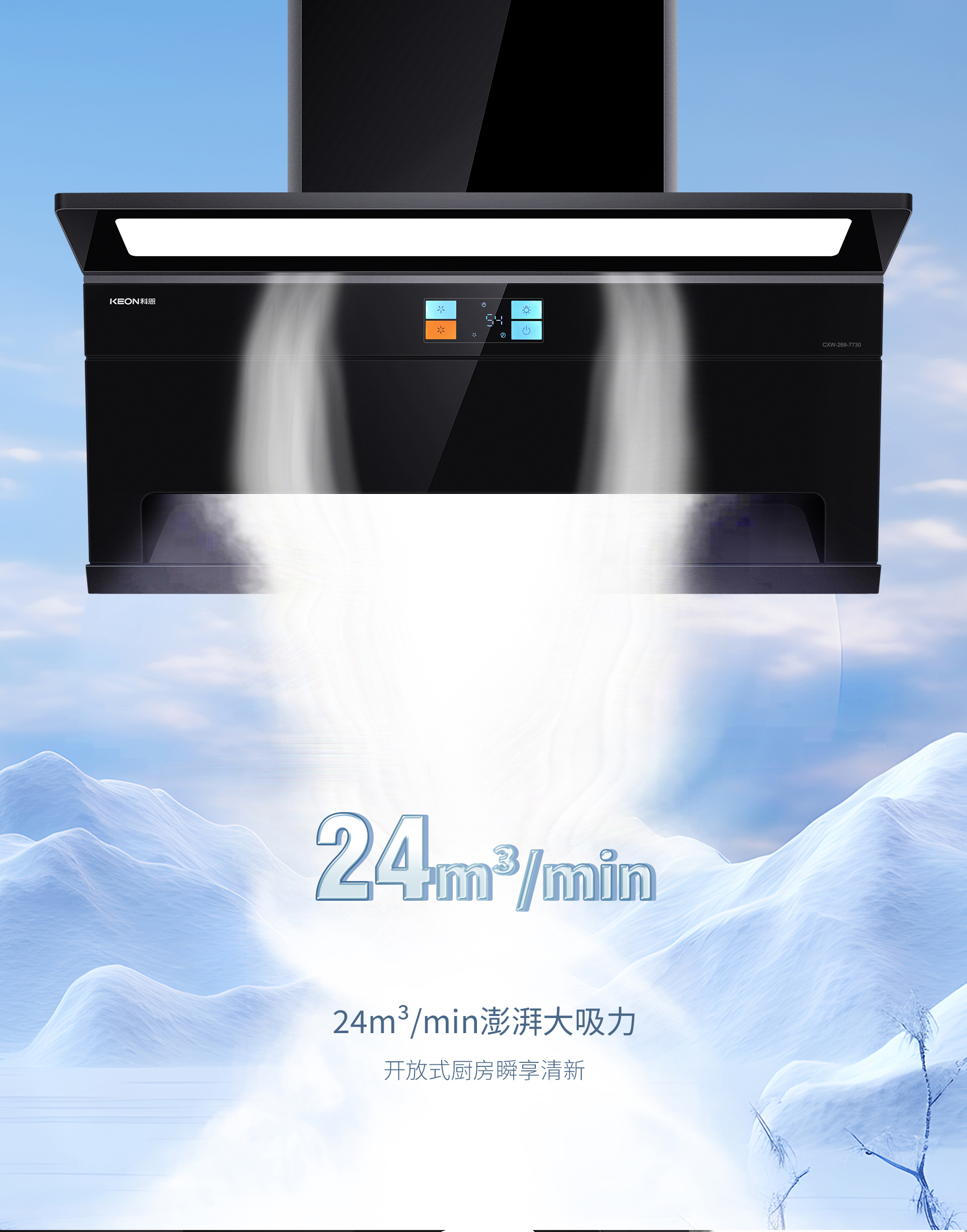 凈煙實力,守護呼吸健康。24m³大吸力瞬吸無蹤,開放式廚房不怕跑煙,頂側雙吸1+1>2雙重鎖煙。1000Pa強勁風壓,烹飪高峰拒絕油煙倒灌,負壓區內傾滑翔設計,油煙順勢直排不滯留,3分鐘延時關機,烹后余煙一網打盡。