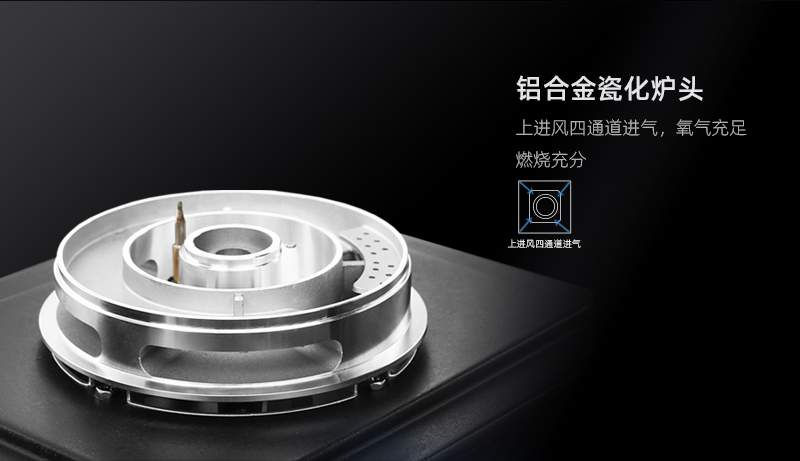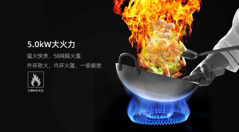 - 5.0kW大火力猛火快烹,58純銅火蓋,鋁合金瓷化爐頭,上進風四通道進氣