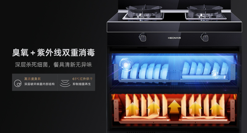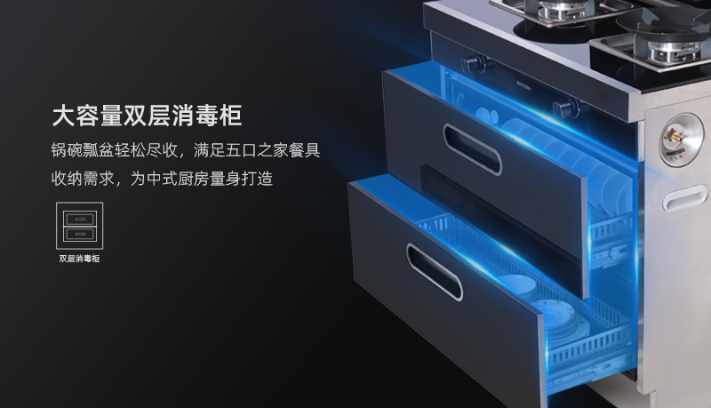 - 大容量雙層消毒柜,鍋碗瓢盆輕松盡收,臭氧+紫外線雙重消毒,深層殺死細菌